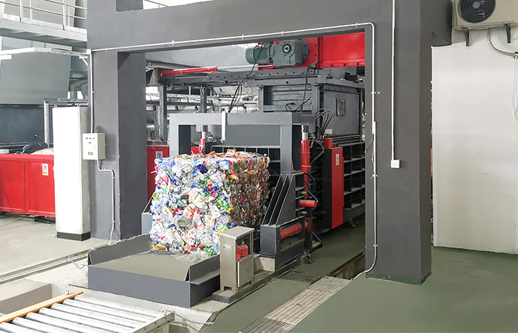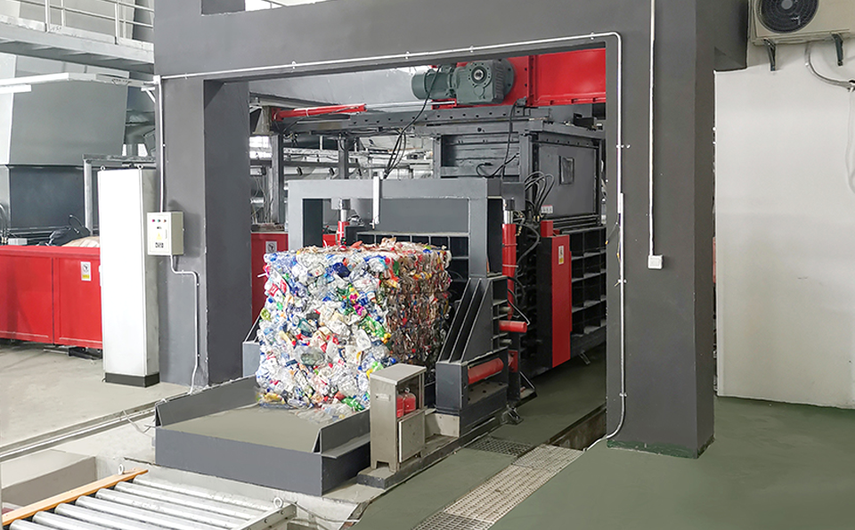 Recycled mixed plastic materials are transported by vehicle to the unloading area for temporary storage. A loader then feeds the materials into a stepper flying shear bag-breaking machine, which splits large bags into bulk materials (this improves the screening efficiency of subsequent sorting equipment).